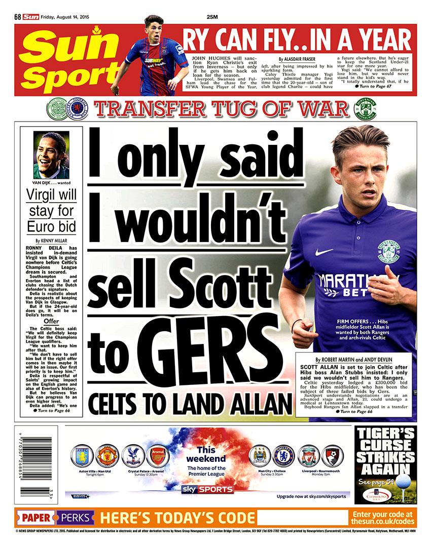 Váratlan fordulattal ért véget a legnagyobb nyári szappanopera, Scott Allan a Celtichez igazolt. Az örök rejtély marad, hogy mennyi beleszólása volt neki a dologba, de egyszerűen nehéz elképzelni, hogy valaki önszántából eljut innen -> ide. Mindenesetre a Celtic kábé ugyanannyit adott érte (300 ezer körül), mint amennyit mi ajánlottunk (a Rotherham 400 fölé is ment, de oda még annyira se vágyott), de hozzácsapta a tavaly a Hibsnél kölcsönlévő Dylan McGeouch-ot végleg + egy másik középpályást, Liam Hendersont kölcsönbe. Alan Stubbs, a Hibs edzője pedig egykori Celtic játékosként egyértelmű volt, hogy hova adná szívesen Allant, még akkor is, ha olyanokat mondott, hogy szerinte akár 1 milliót is megér.